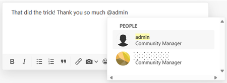 @mentions allows users to call out other community members and community content within a post. This is helpful for responding to a forum topic when you want to link it to another post that includes helpful information. Community supports two kinds of @mentions: User Mentions Content Mentions User mentions With User Mentions, users can call out specific users in their posts and invite them to join the conversation. You might @mention a user when you know they can answer a question or supply valuable insight into a thread. Also, you may just want to ensure they see when you directly thank or give them public praise. For example, you want to thank a user (admin) for their great answer to a question you asked. After clicking the “Reply” button, enter an "at" symbol (@) followed by their username, “@admin”. As you type, a pop-up menu appears with matching names. You can either continue typing the name or select a name from the list. When you select or finish entering the name, the mentioned username is highlighted, as shown here: When users are mentioned in posts, they receive an email notification. Content mentions Content Mentions enable users to call out specific posts within the body of a message. This is a way to quickly embed a link to other content in the community. Content mentions are supported in all conversation styles in both topics and replies/comments. For example, you respond to a forum topic and want to link to another post that includes helpful information. Type the @ symbol and any keywords in the subject or body of the message you want to link to. As you type, search results with messages matching that keyword organized by conversation style appear in the pop-up. You may enter multiple words in the pop-up. When multiple words are entered, all words must be present in the subject and/or body. When you select an item in the list, the subject of the post is highlighted with a hyperlink in the body of your message. When content is mentioned in posts, authors are sent email notifications.118Views0likes0CommentsFollows & notifications